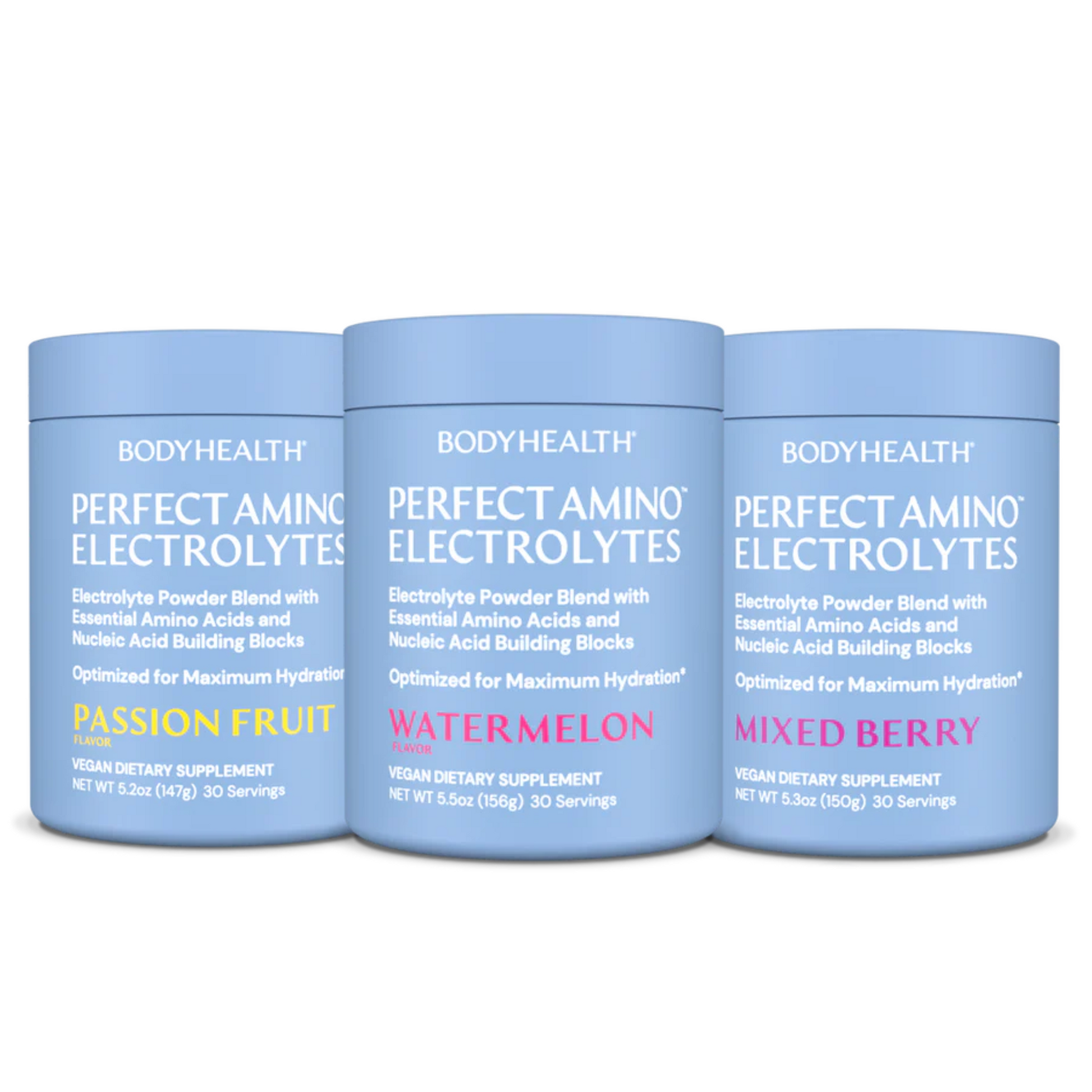 Electrolytes are necessary for hydration, energy, recovery, and mental clarity. They power our nervous system, regulate our water levels, allow our cells to function, and are key to protein synthesis, recovery, and even brain function. And they're vital for weight loss. Lack of electrolytes can cause dizziness, cramps, headaches, exhaustion, mental confusion, and even affect our heartbeat. But they are exact minerals and they're needed by the body in exact ratios. Too much of one and not enough of another can actually exacerbate the problems they're supposed to address. In fact, the wrong ratio can even cause dehydration and bloating, not to mention weight gain and slower recoveries. PERFECT AMINO™ Electrolytes are precisely formulated for complete intracellular absorption in the exact ratios needed to maximize hydration of the cells so they can fully recover and operate at peak efficiency. But we go beyond this, adding in 2g of PERFECT AMINO™ per serving of electrolytes, and this is important. Essential amino acids are needed by our cells to fully utilize the electrolytes received. We cannot get the maximum benefit of electrolytes without our cells receiving essential amino acids at the same time. PERFECT AMINO™ Electrolytes is also free of the sugars, caffeine, colorants, and toxins other formulas use to make up for poor ratios. It contains no Gluten, Soy, Dairy, Sugar, or Erythritol, and 100% Vegan. PERFECT AMINO™ Electrolytes is the complete electrolyte recovery solution.